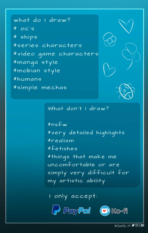 -To ask me for a commission you can contact me through my DM on Twitter/X Instagram or Facebook (the latter is not so recommended)-payment will always be first-the sketch will always have a watermark-if the drawing becomes too complicated it will be canceled